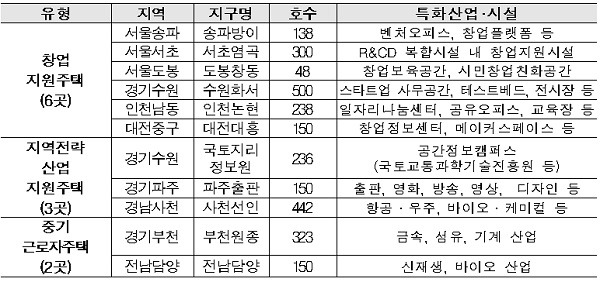 이번 지자체 공모를 통해 선정된 창업지원주택 6곳과 지역전략산업 지원주택 3곳, 중기근로자 지원주택 2곳은 청년 등의 주거수요, 창업지원시설 등 일자리와의 연계성 등을 두루 고려해 최종 선정됐다.