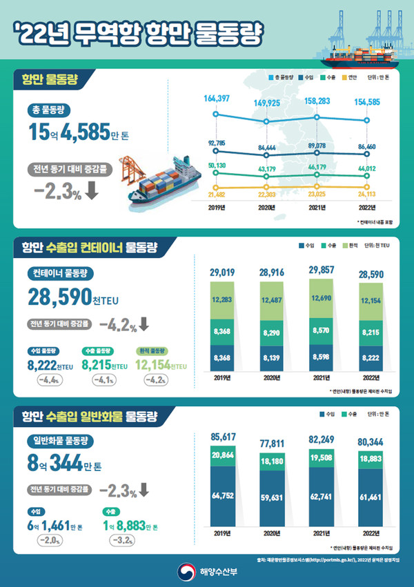 수출입 물동량은 우크라이나 사태 장기화와 세계경기 둔화에 따른 영향으로 전년(13억 5258만 톤) 대비 3.5% 감소한 13억 472만 톤으로 집계됐다.