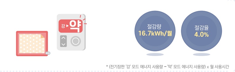 산업부와 한국에너지공단에 의하면 전기장판 온도를 강에서 약으로 한단계만 낮춰 사용해도 월 1760원(16.7kWh)을 절약할 수 있다.