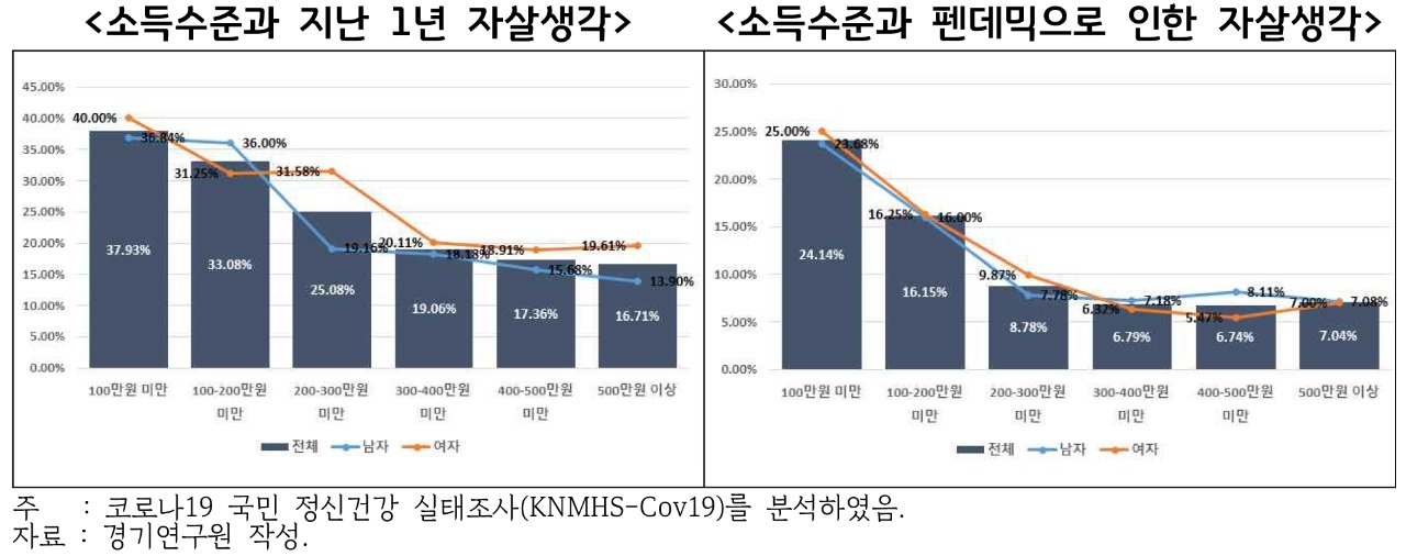 보고서에 따르면 코로나19 팬데믹으로 인한 우울증상 유병률은 월평균 가구소득 100만 원 미만인 소득 최하위 계층(32.8%)과 월평균 가구소득 500만 원 이상인 최상위 계층(13.4%)의 격차가 두 배가 넘는 2.4배였고, 불안장애의 경우 각각 46.5%와 27.9%로 그 격차가 18.6%P로 나타났다. ‘코로나19 팬데믹으로 인해 자살 생각’을 한 비율도 최하위 계층이 24.1%로, 최상위 계층(6.74%) 대비 약 3.6배 많았다.