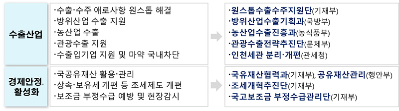 경제도약은 수출·수주 애로사항 원스톱 해결을 통해 기업을 지원하고, 방위산업·농산업·관광 등 분야별 수출 전담조직을 설치하여 경쟁력 강화한다.