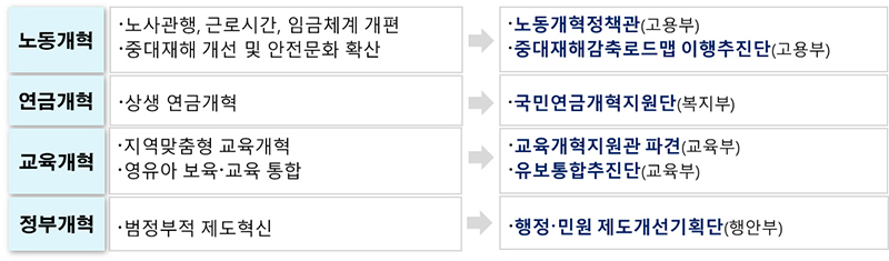먼저 ‘3+1 개혁’은 시대적 요구 및 급변하는 경제상황에 맞게 노동·연금·교육 및 정부개혁을 적극 추진할 수 있도록 조직 기반을 마련한다.