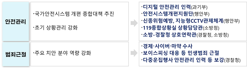 또한 소방-경찰 상황실 상호연락관 파견을 통해 대형사고 발생 시 기관간 협력체계를 구축하며, 경제·사이버·마약 수사 등 범죄근절을 위해 주요 치안분야 역량을 강화한다.