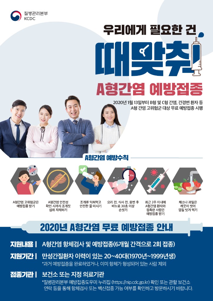질병관리본부는 2020년 1월 13일부터 20∼30대(1980~1999년생) A형간염 고위험군을 대상으로 시행하고 있는 무료 예방접종을 2월 1일부터는 40대(1970∼79년생)까지 확대 시행할 예정이라고 밝혔다.