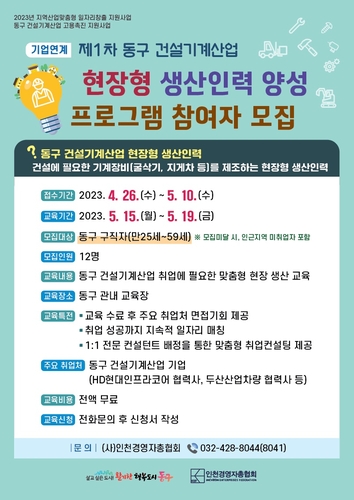 2023년 지역·산업 맞춤형 일자리창출 지원 사업은 인천시 공모사업으로 동구는 ㈔인천경영자총협회와 컨소시엄을 구성해 '건설기계산업 고용촉진 지원 사업'을 공모, 최종 선정돼 사업비의 90%를 시비로 확보했다.