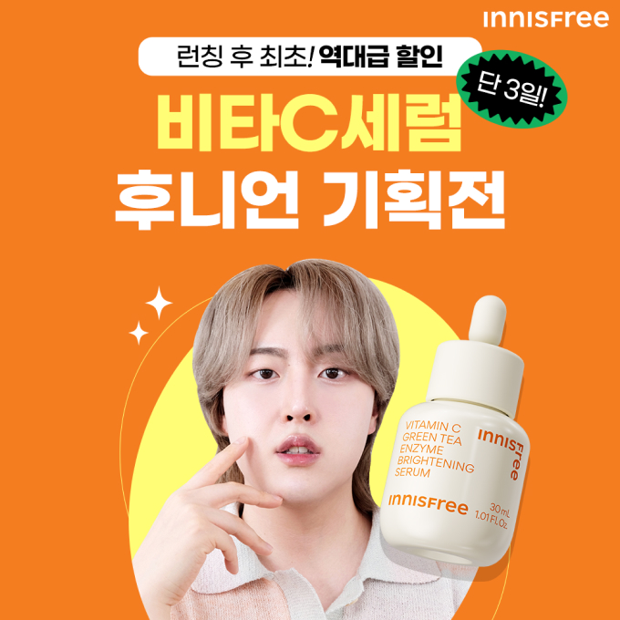 고효능 자연주의 브랜드 이니스프리(www.innisfree.com)가 뷰티 유튜버 ‘후니언’과 함께 ‘비타C 그린티 엔자임 잡티 토닝 세럼’ 기획전을 진행한다.