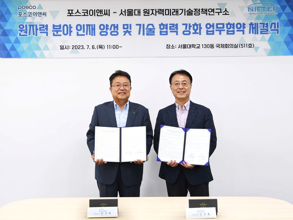 포스코이앤씨는 지난 6일 서울대학교에서 포스코이앤씨 한성희 사장과 김곤호 서울대 원자력 미래기술정책연구소장, 홍유석 서울대 공과대학장, 박군철 서울대 원자핵공학과 명예교수 등이 참석한 가운데 `원자력 분야 인재 양성 및 기술 협력 강화`를 위한 업무협약을 체결했다. 지난달에는 한국원자력산업협회와도 원자력 사업 추진 가속화를 위한 업무협약을 체결한 바 있다.