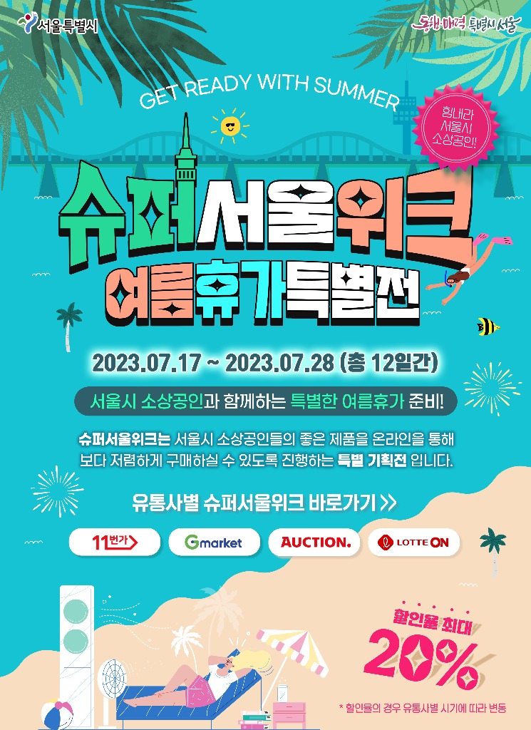 이번 ‘슈퍼서울위크_여름휴가특별전’는 국내 대표 온라인쇼핑몰 ▴11번가 ▴G마켓 ▴옥션 ▴롯데온 4곳에서 동시에 열린다. 가전, 뷰티, 반려동물용품 등 1만 3천여 소상공인들이 참여하며 최대 20%(최대 1만원) 할인된 금액으로 상품을 구매할 수 있다.