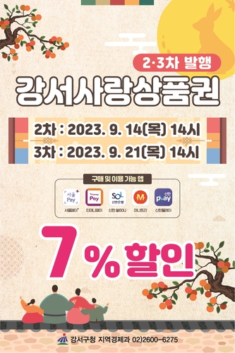 구 관계자는 "민족대명절 추석을 맞이해 소비자와 판매자 모두가 웃을 수 있도록 매년 인기리에 완판 행진을 이어가는 서울강서사랑상품권을 큰 규모로 추가 발행한다"라며 "소상공인 지원과 소비 촉진으로 지역 경제 활성화에 기여할 수 있도록 적극 노력하겠다"라고 말했다.