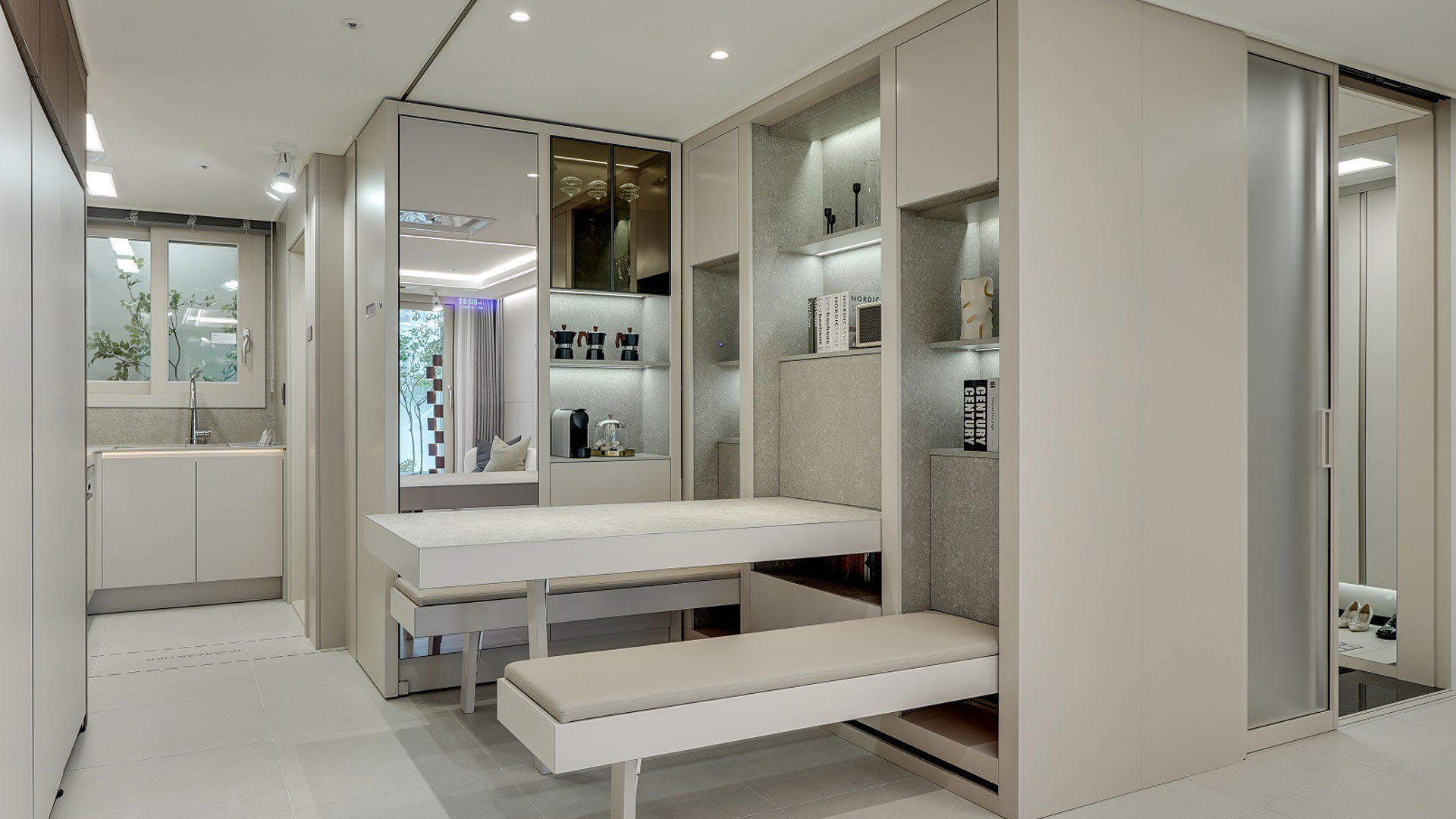 최근 업그레이드된 현대건설 ‘2023 트랜스포밍 월 & 퍼니처’도 우수디자인상품으로 선정됐다. 주방에서 전동식 가구 벽체를 버튼 하나로 움직이며 벽면에 매입된 식탁, 벤치, 테이블 등의 가구를 활용하여 정해진 공간을 가변적으로 만들어 실내공간의 사용성을 극대화했다.