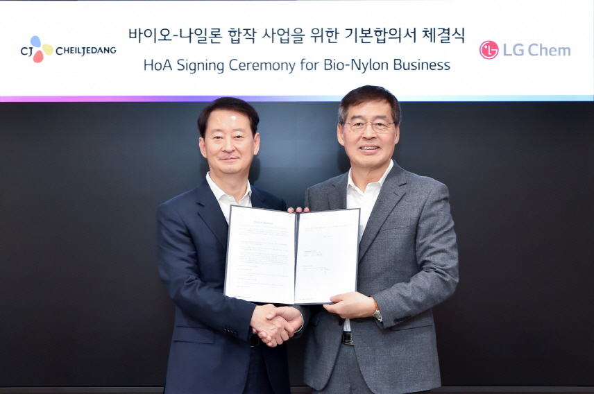 LG화학은 14일 CJ제일제당과 여의도 LG트윈타워에서 바이오 원료(*PMDA) 기반 친환경 나일론 생산 및 판매 합작사 설립을 위한 주요 조건 합의서(HOA)를 체결했다고 밝혔다.