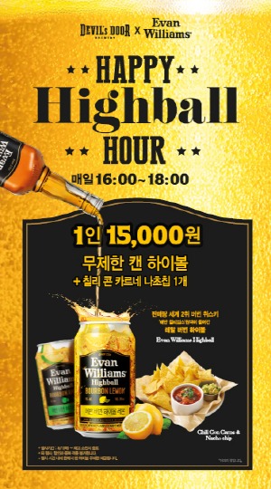 신세계푸드의 아메리칸 스타일 게스트로펍 ‘데블스도어’가 아메리칸 대표 버번 위스키 ‘에반 윌리엄스’와 손잡고 부담 없는 가격으로 하이볼을 즐길 수 있는 ‘하이볼 해피아워’를 실시한다.