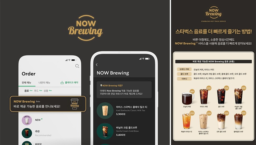 NOW Brewing은 출근길이나 점심시간 등 주문이 몰리는 특정 시간대에 일부 음료를 사이렌 오더로 주문 시 더 빠르게 제공받을 수 있는 서비스다. 현재 골드 등급 회원이 ‘오늘의 커피’, ‘아이스 커피’, ‘콜드 브루’, ‘바닐라 크림 콜드 브루’, ‘아이스 스타벅스 클래식 밀크 티’를 최대 2잔까지 주문할 수 있다.