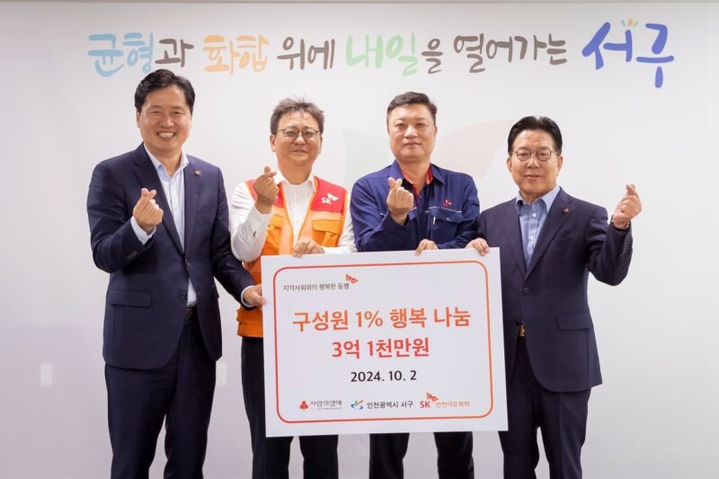 SK인천석유화학은 지난 2일 인천 서구청에서 열린 구성원 1% 행복나눔 기금 전달식에서 인천사회복지공동모금회를 통해 기금 3억 1,000만원을 기부했다.