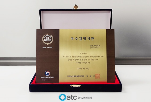 OATC는 검정업무에서의 성실도와 전문성, 실사 점검 시 적합 판정 등 다양한 평가 요소에서 전문성과 우수성을 인정받아 2024년 농산물 무기성분·유해물질 검정 분야의 우수검정기관으로 선정돼 표창을 수상했다.