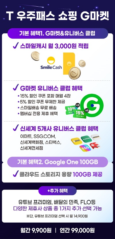 T 우주패스 쇼핑 G마켓 론칭 이벤트는 10월 31일까지 진행한다. 행사 기간 동안 ‘T 우주패스 쇼핑 G마켓’(월 구독료 9,900원) 또는 ‘T 우주패스 G마켓 mini’(월 구독료 5,900원) 가입 고객 중 선착순 6만명에게 스마일캐시 6,000원을 제공한다. G마켓과 옥션에서 현금처럼 사용할 수 있는 쇼핑지원금으로, 구독 상품 기본 혜택인 스마일캐시 3,000원에 론칭 이벤트 혜택 3,000원이 더해졌다.