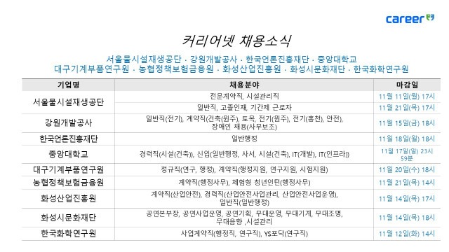 취업 포털 커리어가 서울물재생시설공단, 강원개발공사, 한국언론진흥재단, 중앙대학교, 대구기계부품연구원, 농협정책보험금융원, 화성산업진흥원, 화성시문화재단, 한국화학연구원 채용 소식을 8일 발표했다.