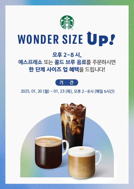 스타벅스는 오는 1월 20일부터 1월 23일까지 4일간 오후 2시에서 저녁 8시사이 스타벅스 매장을 방문해 에스프레소 및 콜드 브루 제조 음료를 구매하는 모든 고객들에게 무료로 사이즈 업그레이드 혜택을 제공한다.