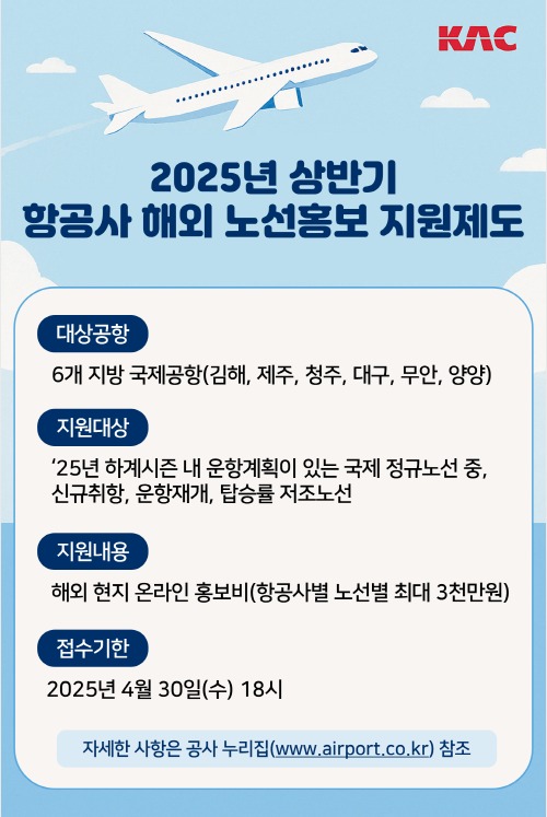 공사는 향후 동계시즌(10.26~’26.3.28) 운항계획에 맞춰 '하반기 해외노선 홍보지원제도'를 추진할 예정이며, 자세한 내용은 공사 누리집(www.airport.co.kr)에서 확인할 수 있다.