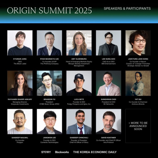스토리는 이번 오리진 서밋 개최 소식과 함께 대한민국 IP를 세계에 알린 주역들이 대거 포함된 연사 라인업을 선공개했다. △블랙핑크의 총괄 프로듀서 테디가 창업한 ‘더블랙레이블’의 정경인 대표 △하이브 뮤직그룹 유동주 APAC 대표 △K팝 장르의 창시자로 평가받는 SM엔터테인먼트 이성수 CAO(Chief A&R Officer) △‘아기상어’를 제작한 더핑크퐁컴퍼니 이승규 공동창업자 △‘리니지의 아버지’라 불리는 송재경 넥슨 공동창업자 및 Verse8 고문이 연사 및 참석자로 나선다. 이외에도 △샌딥 친찰리(Sandeep Chinchali) 스토리 최고 AI 책임자 △최성환 SK네트웍스 사업 총괄 사장 △에이미 올덴버그(Amy Oldenburg) 모건스탠리 투자운용 신흥시장 주식 총괄 △레이헤인 샤리프-애스커리(Rayhaneh Sharif-Askary) 그레이스케일 매니징 디렉터 △루카 네츠(Luca Netz) 퍼지펭귄(PENGU) 창업자 △얏 시우(Yat Siu) 애니모카 브랜즈 회장 등 글로벌 AI, 금융, 가상자산 리더들도 자리를 빛낼 예정이다.