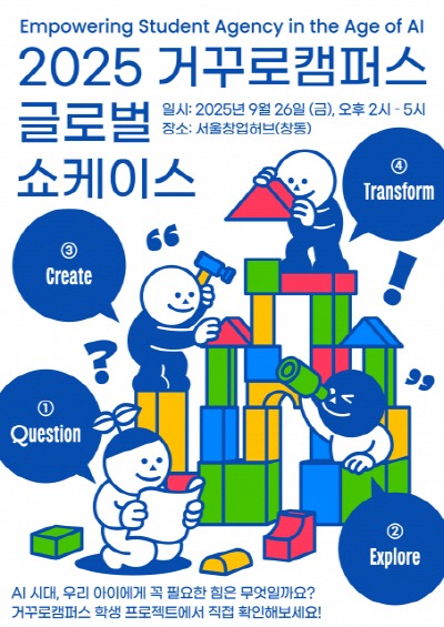 서울시교육청 등록 대안교육기관 거꾸로캠퍼스가 9월 26일(금) 오후 2시 서울창업허브 창동점에서 ‘2025 Global Project Showcase’를 개최한다. 이번 행사는 학부모와 교사, 교육기관 관계자, 사회적 기업, 청소년 창업 전문가 등 교육에 관심 있는 사람이라면 누구나 참여할 수 있다.