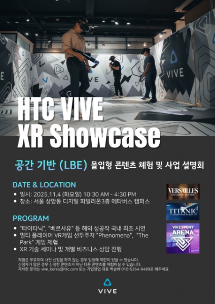 이번 행사에서는 HTC VIVE의 위치 기반 엔터테인먼트(LBE) 기술을 통해 대형 공간에서 참가자가 자유롭게 이동하며 체험할 수 있는 몰입형 콘텐츠를 선보인다. 특히 전 세계적으로 흥행한 ‘타이타닉’, ‘베르사유’ 등 해외 성공작을 국내 최초로 시연할 예정이다.