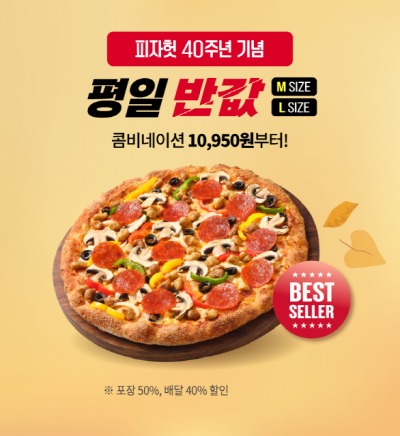 이번 프로모션은 평일 포장 시 50%, 배달 주문 시 40% 할인이 적용된다. L 사이즈는 포장 및 배달 주문 모두 혜택을 이용할 수 있으며, M 사이즈는 포장 주문 시에만 적용된다. 할인 적용 가격은 L 사이즈 포장 1만3950원, 배달 1만6740원이며, M 사이즈는 포장 1만950원이다.