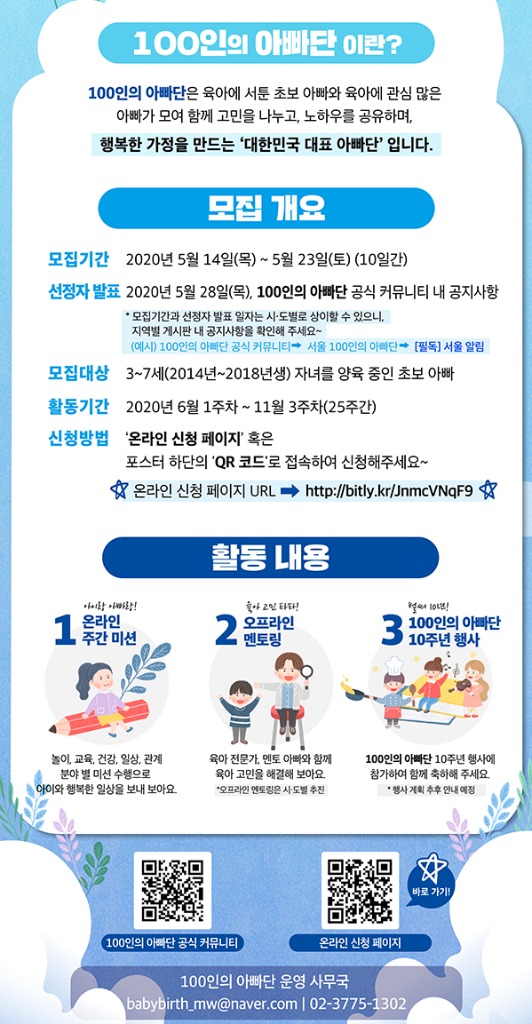 신청 방법은 100인의 아빠단 공식 모임(https://cafe.naver.com/motherplusall)에서 확인할 수 있으며, 선정자 발표는 28일 커뮤니티 공지사항에서 발표할 예정이다.