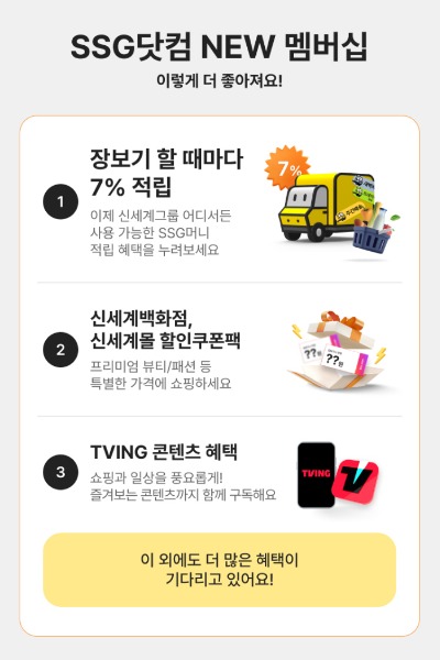 SSG닷컴이 업계 최고 수준인 ‘7% 적립’ 혜택과 ‘티빙 OTT’를 앞세운 새 멤버십을 예고했다. 직관적인 혜택이 멤버십 갈아타기를 고민하는 고객 수요와 맞물려 시너지가 날 것으로 기대된다.