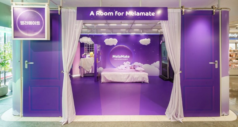 팝업스토어 내부는 실제 침대를 배치한 체험 공간과 보라색 조명을 활용한 포토존으로 구성됐다. 멜라메이트 팝업스토어는 올리브영 강남 타운 3층에서 2월 한 달간 운영된다.