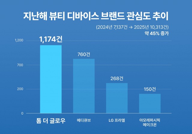 딥블루닷의 소셜 리스닝 및 리뷰 분석 솔루션 싱클리는 9일 지난해 뷰티 디바이스 주요 브랜드의 온라인 언급량(네이버 카페, 인스타그램, 유튜브 쇼츠, X 등에 게재된 포스팅 수)을 분석한 결과, 톰 더글로우가 총 1174건으로 가장 높은 관심도를 기록했다고 밝혔다. 뒤이어 APR 메디큐브 760건, LG전자 프라엘 268건, 아모레퍼시픽 메이크온 150건 순으로 나타났다.