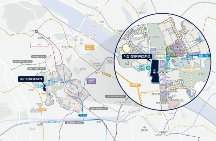 단지가 들어서는 곳은 검단신도시 5개 특화사업 중 하나인 ‘워라밸빌리지’의 중심 입지다. 예정된 중앙호수공원과 나진포천이 인접한 수변 입지를 확보했으며, 스마트워크센터, 통합보육센터, 근린생활시설, 생활체육·문화 SOC센터 등이 함께 조성되는 자족형 복합 생활권에 위치한다. 입주민들은 체육시설과 다목적홀, 취미 공간 등을 도보권에서 이용할 수 있을 전망이다.