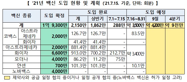 한편, 15일까지 7월 도입 예정 물량 중 288만 회분(화이자 백신 212만 7000 회분, 모더나 백신 75만 회분)이 도입 완료됐다.