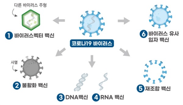 또 사멸시킨 코로나19 바이러스를 체내 주입해 면역반응을 유도하는 불활화 백신과 코로나19 바이러스의 표면항원 유전자를 주입해 체내에서 표면항원 단백질을 생성해 면역반응을 유도하는 DNA 백신이 있다.
