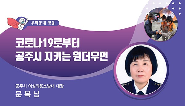 행안부는 코로나19로부터 지역과 주민을 지킨 ‘충남의 영웅’으로 코로나19 예방접종센터에서 어르신 백신 접종을 돕고 마스크 제조공장 인력 지원에 헌신한 문복님 공주시 여성의용소방대 대장을 선정했다.