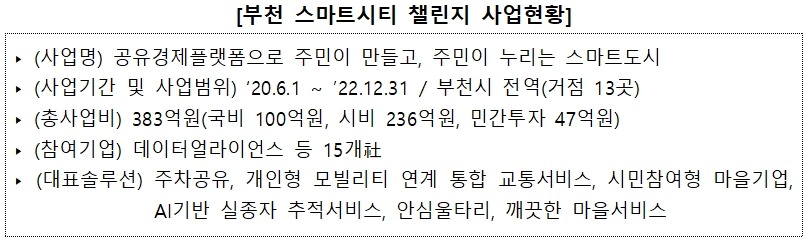 한편, 부천시 공유경제 플랫폼 ‘스마트 시티패스’는 국토교통부 스마트시티 챌린지 사업에 선정(‘20.2)되어 스마트시티 구축사업의 일환으로 추진해왔다.
