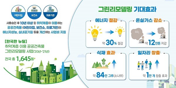 공공건축물 그린리모델링은 정부가 추진하고 있는 한국판뉴딜의 대표과제로 지난해부터 올해까지 2년간 국비 4500억 원을 투입해 패시브·액티브·신재생 등의 기술 적용을 통해 국공립 어린이집·보건소·의료시설 등 공공건축물의 에너지성능과 실내공기질을 개선하는 사업이다.