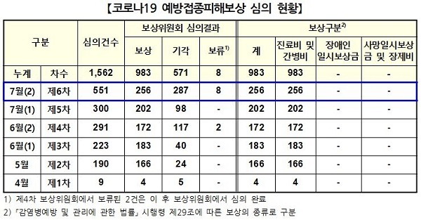 피해보상전문위는 피해보상 신청 사례 총 551건 가운데 발열, 두통, 근육통, 어지럼증, 알레르기 반응 등으로 치료를 받은 256건(46.5%)에 대해 보상하기로 했다.