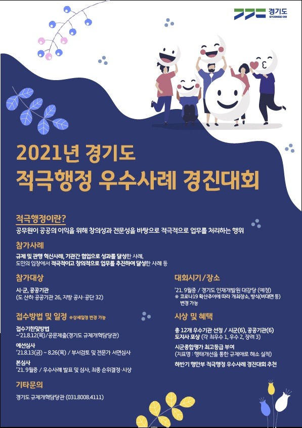 경기도가 시군 및 공공기관에서 추진하는 적극행정 우수사례 성과를 공유하는 ‘2021년 적극행정 우수사례 경진대회’를 9월 중 경기도인재개발원에서 개최할 예정이라고 3일 밝혔다.