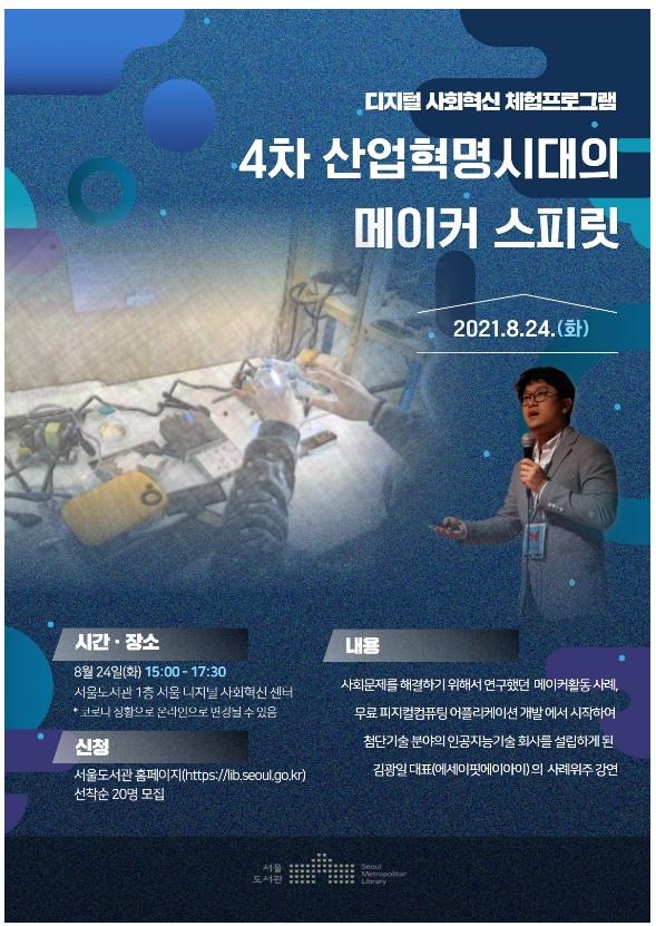 서울도서관은 8월 24일(화) 15시에 ‘4차 산업혁명시대의 메이커 스피릿(the maker sprit)’을 주제로 김광일 대표(에세이핏에이아이)를 초빙하여 강연을 개최한다.