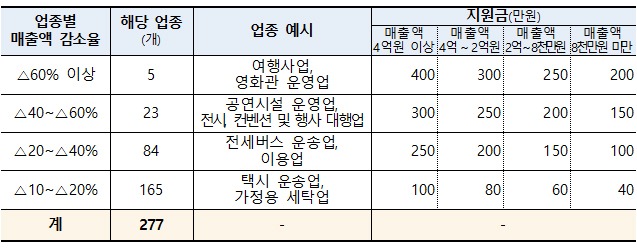 경영위기업종에 속하면서 매출액이 감소한 사업체는 업종별 매출감소율(4개) 및 사업체 매출액 규모(4개)에 따라 400만~40만원을 지급받게 된다.