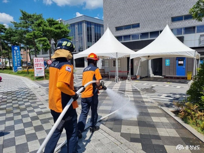 낮 최고 기온이 35.7℃로 폭염이 기승을 부렸던 지난 6일 공주시보건소 선별진료소를 찾은 한 주민은 소방차 살수 지원 광경을 목격하고 “폭염에 화마와 싸우기도 힘들 텐데 소방관들이 좋은 일을 한다”며 고마워했다.