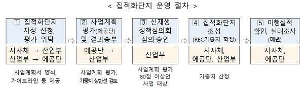 산업부는 지자체의 집적화단지 신청서를 검토한 후 전담기관인 에너지공단(신·재생에너지센터)에서 운영하는 평가위원단의 평가를 거쳐 신재생에너지 정책심의회에서 심의할 계획이며, 평가·심의를 만족한 사업은 연내에 집적화단지로 지정될 예정이다.