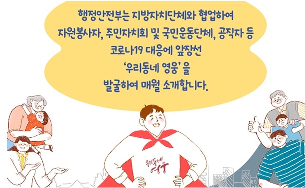 행안부는 코로나19로부터 지역과 주민을 지킨 주인공들의 감동사례를 공유하고 지역공동체의 회복과 연대를 위해 전국 17개 시·도와 협업해 매월 ‘우리동네 영웅’을 선정하고 있다.
