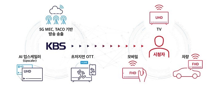 클라우드 기반 차세대 방송 송출 서비스 개념. KBS. 5G MEC, TACO 기반 방송 송출. AI 업스케일러. 초저지연 OTT 송출. 시청자. TV, 모바일, 차량에서 시청.