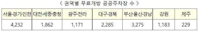 이번 추석 연휴 기간에 「공유누리」와 「공공데이터포털」을 통해 확인할 수 있는 전국의 무료 개방 공공주차장은 총 14,237개이다.