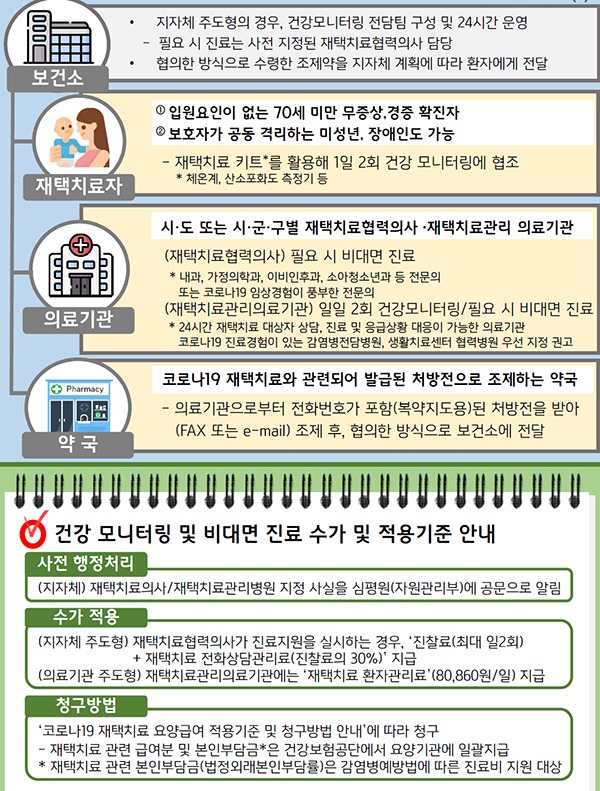 보다 안전한 재택치료를 위해서 건강관리와 응급대응 체계를 확충해 지역사회의 코로나19 관리 역량을 확대하는데, 지역사회 의료기관을 활용해 의료진에 의한 건강모니터링과 비대면 진료·처방를 실시하도록 하고 건강보험 수가를 지급한다.