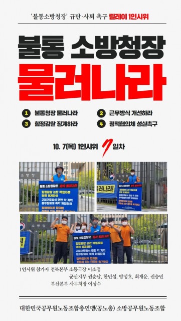 공노총 소방노조는 9월 26일부터 총 4가지 조건(△불통청장 물러나라 △근무방식 개선하라 △함정감찰 징계하라 △정책협의체 성실촉구)을 내걸고, 소방청 앞에서 릴레이 1인 시위를 이어가고 있다고 12일 밝혔다.