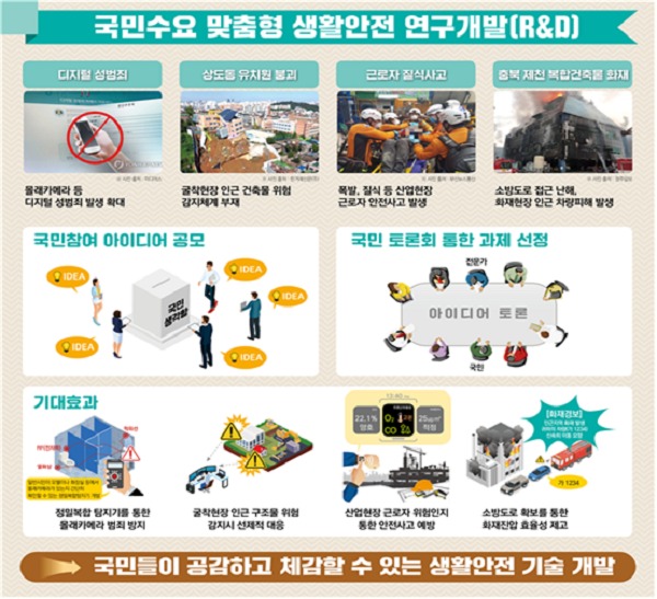 행정안전부는 국민들로부터 생활 속에서 느끼는 재난안전 사고 위험요소나 불안 요인을 해결할 수 있는 아이디어와 주제를 공모하여 연구개발을 지원하는 “국민수요 맞춤형 생활안전 연구개발” 사업을 2019년부터 추진해 오고 있다.