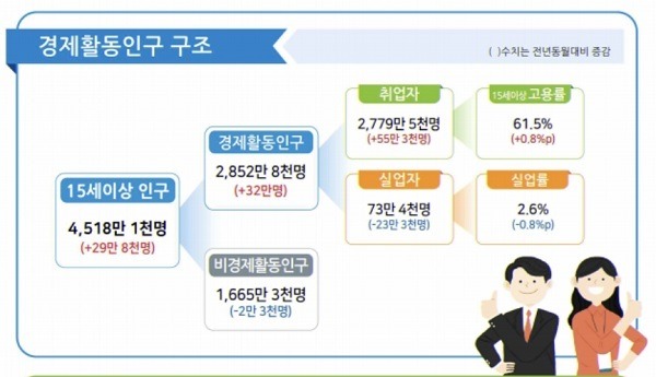 반면 도매 및 소매업(-12만 3000명·-3.5%), 숙박 및 음식점업(-8만 6000명·-4.0%), 공공행정·국방 및 사회보장행정(-8만 1000명·-6.3%) 등은 감소했다.